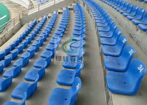 體育場(chǎng)看臺(tái)采用全藍(lán)色的中空吹塑中靠背固定座椅。