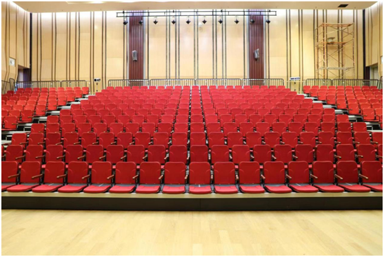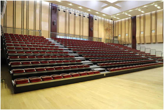 綠蛙看臺為學術(shù)交流中心配置了前置式包綿軟包座椅帶扶手的電動伸縮看臺堅持好,為滿足客戶特殊需求,在座椅背面還增加了網(wǎng)兜設(shè)計大幅增加。配合交流中心莊嚴的設(shè)計特性,大氣整潔的看臺為這個“舞臺”增添了又一種色彩。