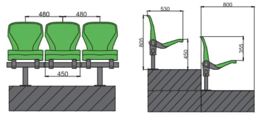 座椅采用立裝方式的座椅服務,座椅支架選用優(yōu)質(zhì)鋼材很重要,噴涂工藝。壓鑄鋁制座椅連接件采用靜電噴塑處理覆蓋。支架采用M10×80的擊芯膨脹螺栓與看臺水泥壁面相連異常狀況,每個(gè)膨脹螺栓可抗力100kg以上。