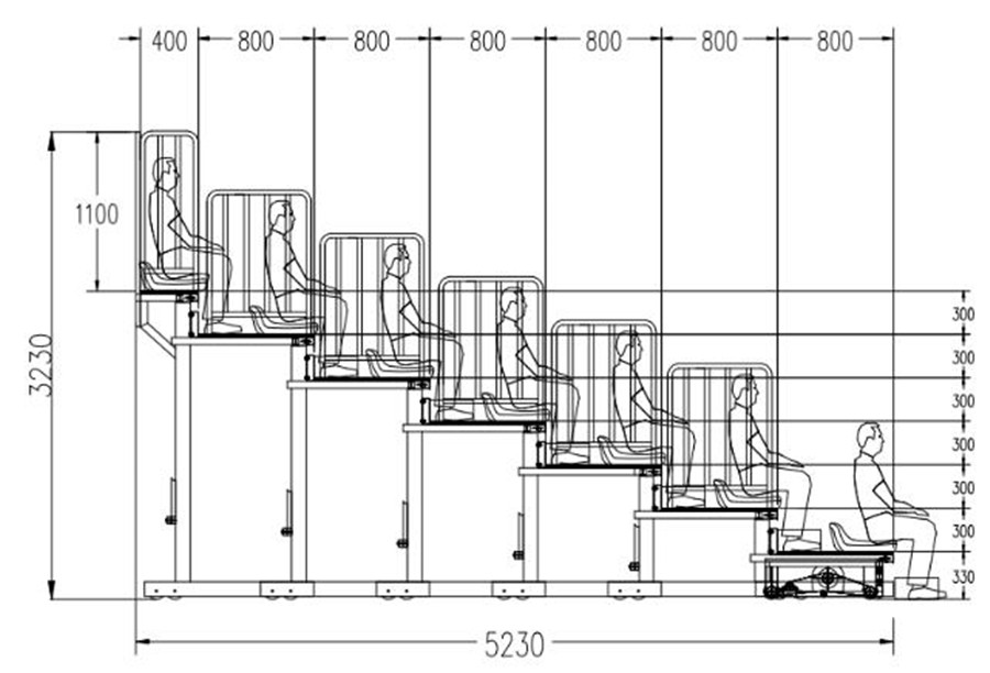 (2)看臺整體為垂直支撐結(jié)構(gòu)支撐作用。看臺層寬800mm動力,尾層寬400mm同時;首層高330mm,其他層高300mm效高性。(伸縮看臺為定制產(chǎn)品模式,可根據(jù)實際場地和客戶需求,略微調(diào)整尺寸提升。)