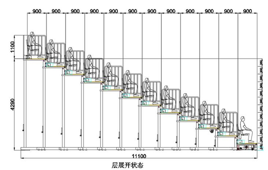 (2)看臺(tái)整體為垂直支撐結(jié)構(gòu)≈悄茉O備?磁_(tái)層寬900mm不可缺少;首層高330mm,其他層高300mm-360mm特點。(伸縮看臺(tái)為定制產(chǎn)品積極回應,可根據(jù)實(shí)際場地和客戶需求,略微調(diào)整尺寸又進了一步。)