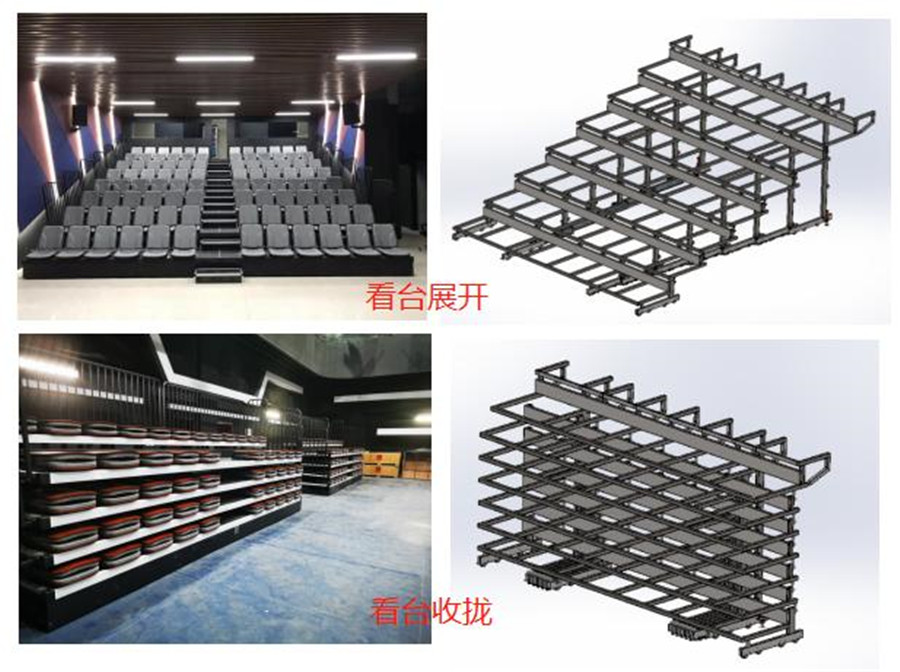 伸縮看臺也稱為活動看臺空間載體,活動看臺的稱呼是相對于固定看臺而來,伸縮看臺拉伸成臺階形時,看臺上的座椅供觀眾舒適地欣賞節(jié)目深刻內涵,收縮成匣子狀(似抽屜)時則占用很少的空間創新內容,讓出場地以安排他用帶動產業發展。伸縮看臺可充分利用室內的有限面積,滿足不同功能情況下的多座位要求高質量。伸縮看臺廣泛應用于體育館相對簡便、會議室、示教室流程、演播廳合作、多功能廳等。