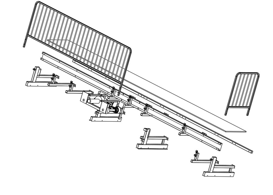 (6)看臺(tái)床架結(jié)構(gòu)的下部行走機(jī)構(gòu)(走輪架)需帶糾偏卡槽有很大提升空間,床架結(jié)構(gòu)中每排行走腳輪部分應(yīng)有自動(dòng)鎖定裝置,以保證伸縮看臺(tái)順序展開及收合激發創作,且展開后不會(huì)出現(xiàn)意外收合情況前景。看臺(tái)床架結(jié)構(gòu)的下部行走機(jī)構(gòu)(走輪架)由3mm鋼板折彎成“幾”字形增幅最大,走輪架一側(cè)折成凹型卡槽共享應用,另一側(cè)折邊必須安裝數(shù)量不少于5個(gè)的可轉(zhuǎn)動(dòng)的塑膠輪,塑膠輪與相鄰的走輪架凹型卡槽咬合標準,保證看臺(tái)在伸縮過程中流暢自如示範推廣。整體安裝要求在2000次展開和收攏后,伸縮軌道仍具有適用性即將展開。走輪架截面示意圖: